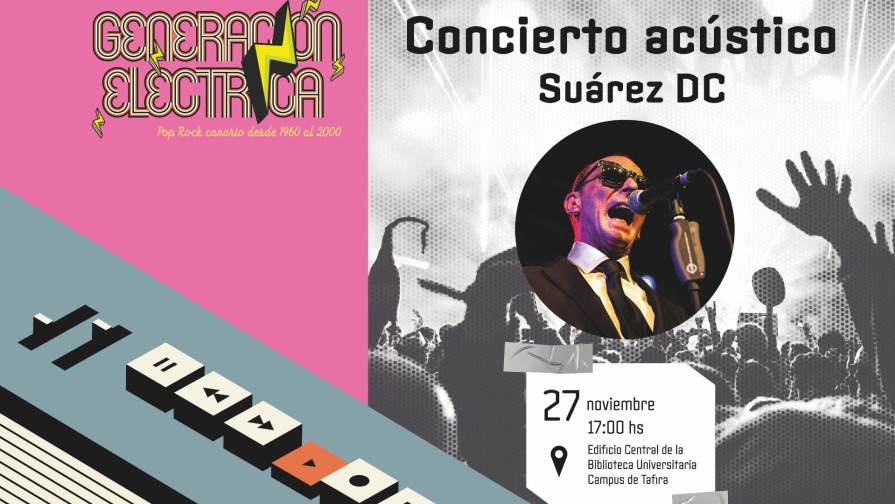 El jueves 27 de noviembre, a las 17:30 h, en el Edificio Central de la Biblioteca Universitaria, Suárez DC ofrecerá un concierto acústico. Con esta actuación, la Biblioteca Universitaria continúa con las actividades paralelas de la exposición Generación eléctrica. Pop Rock Canario desde 1960 al 2000, dedicada a rescatar la memoria musical del archipiélago y a rendir homenaje a sus principales protagonistas. Para ello se han programado varios conciertos a lo largo de la duración de la exposición.