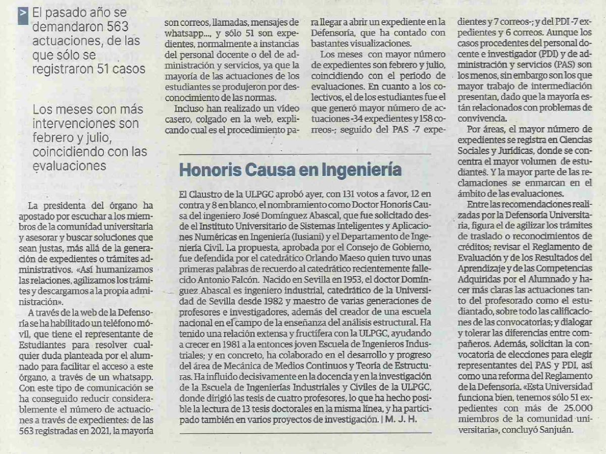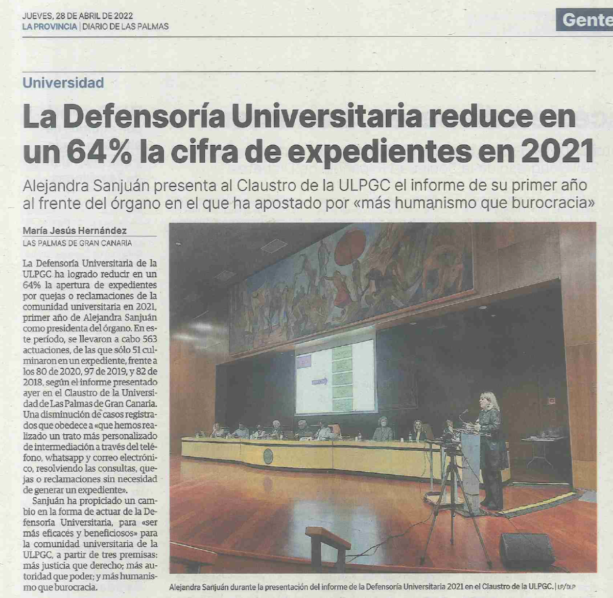 - 27 de abril del 2022 se presenta la memoria de la Defensoría ante el Claustro de la ULPGC