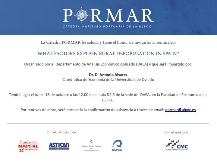 El lunes 18 de octubre de 2021, a las 12.00 horas, en el Aula D2.5 del Departamento de Análisis Económico Aplicado (DAEDA), en la Facultad de Economía, Empresa y Turismo de la ULPGC, tendrá lugar el seminario titulado ‘What factors explain rural depopulation in Spain?’, organizado por el Departamento de Análisis Económico Aplicado y la Cátedra Marítimo-Portuaria (PORMAR) de la Universidad de Las Palmas de Gran Canaria (ULPGC).