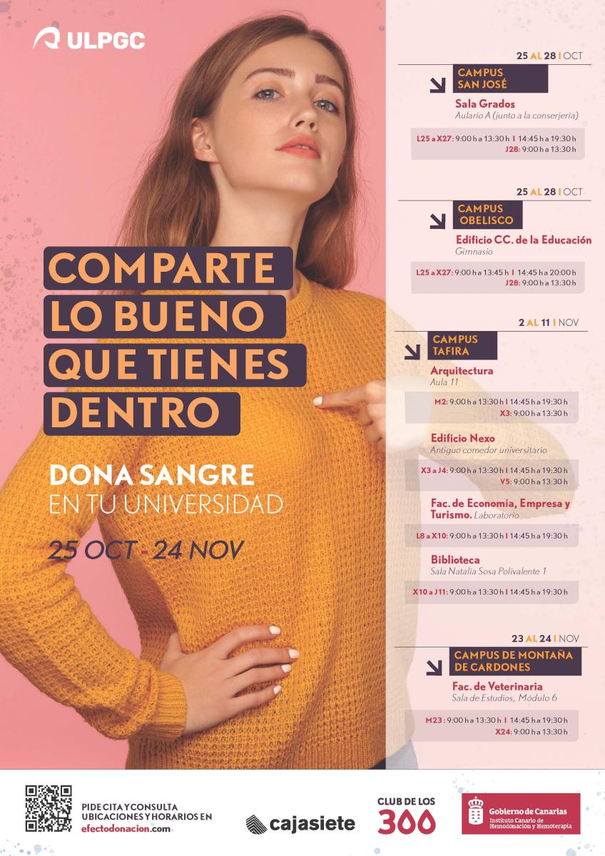 El Instituto Canario de Hemodonación y Hemoterapia (ICHH) comenzará el lunes 25 de octubre una nueva edición de su ya tradicional Campaña de Donación de Sangre en la Universidad de Las Palmas de Gran Canaria (ULPGC). En esta ocasión, en lugar de realizar las donaciones en las unidades móviles del ICHH, se han habilitado salas en los cuatro Campus universitarios en Gran Canaria, para que las donaciones puedan realizarse con seguridad, y lo/as donantes deberán solicitar cita previa online (pincha aquí).